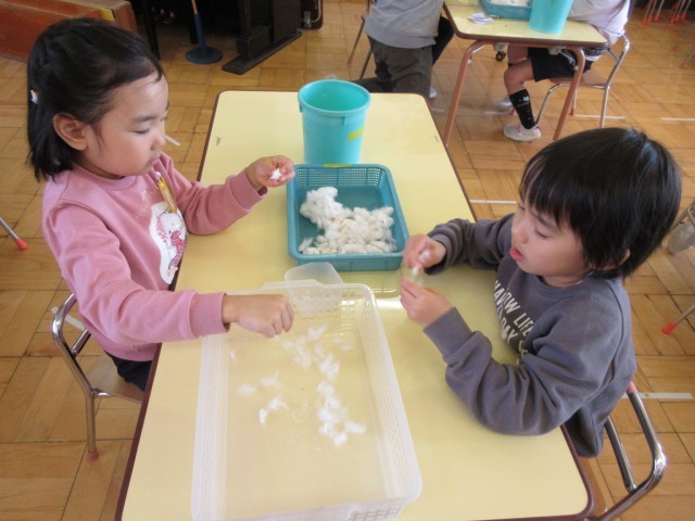 ワタを優しく引っ張って丁寧に一つずつ種を取り出します。隠れている種を探したりフワフワのワタの感触を楽しんだりできました。