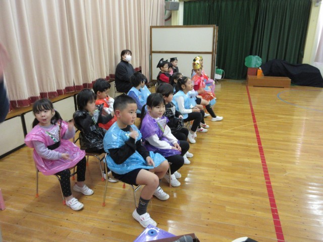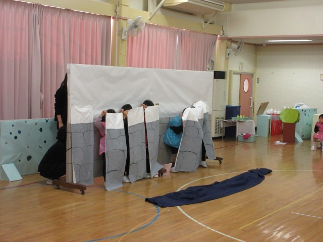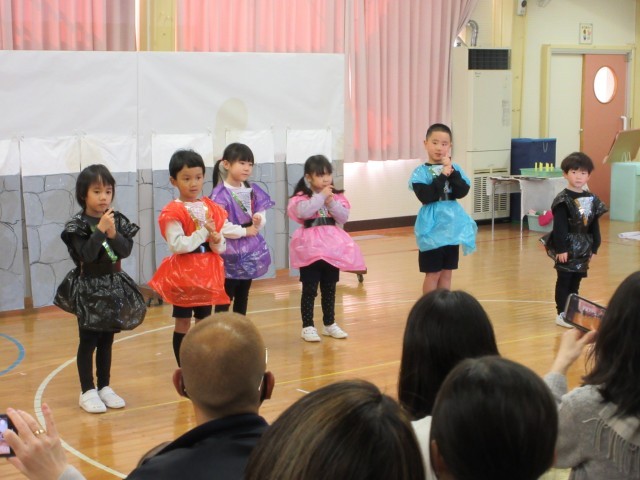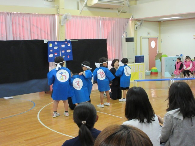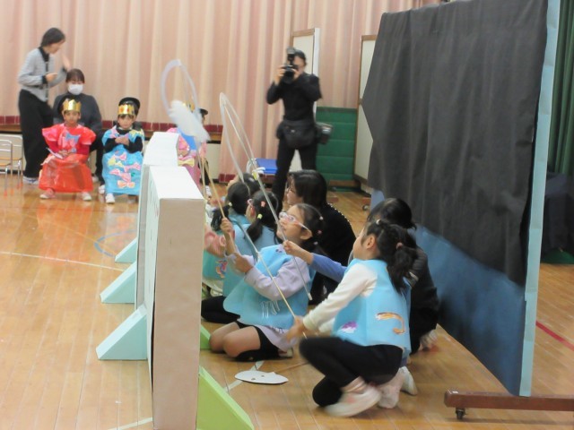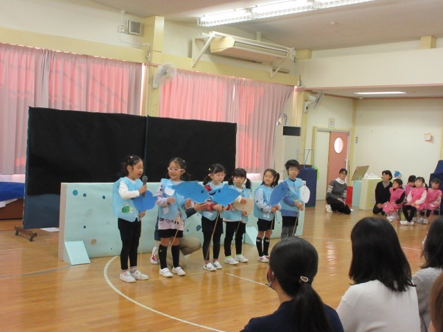 星の組は生活発表会ではグループごとに発表しました。水族館グループは自分たちの作った水族館を発表した後にイルカショーのペープサートをしました。