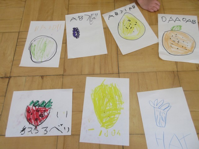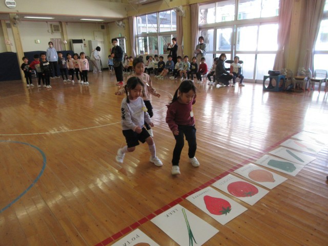 カードには野菜や果物が書いてあり、オウス先生の英語を聞いて取りに行くゲームです。