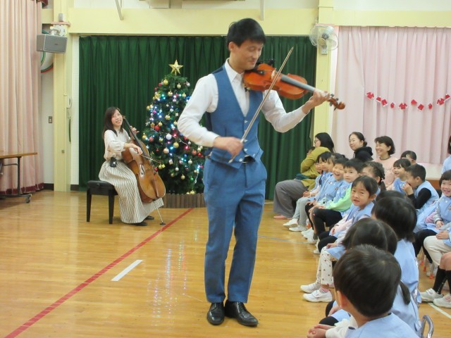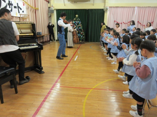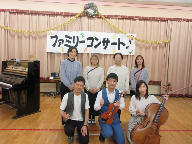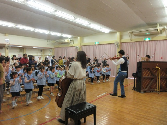 Everly(エバリー)が来園し、ファミリーコンサートを行いました。バイオリン、チェロ、ピアノの演奏を間近で聴いてみんな大喜び!