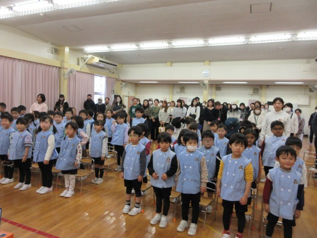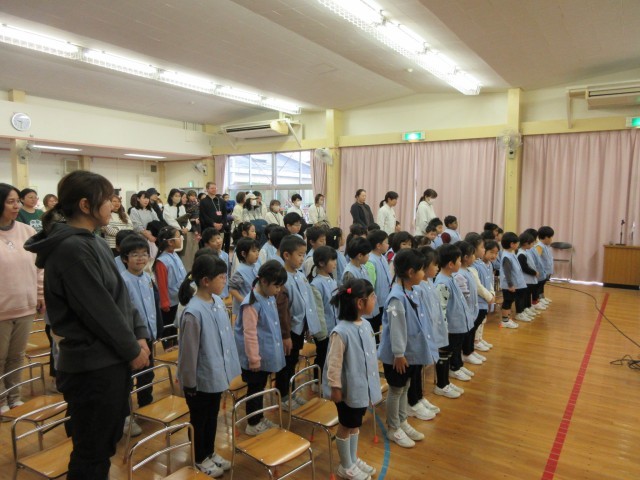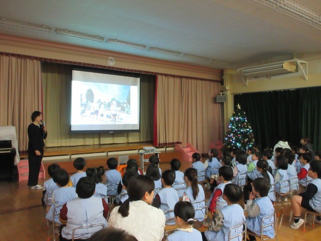 2学期の終業式をしました。園長先生の話は2学期に楽しかったことや頑張ったことを写真を見ながら話しました。