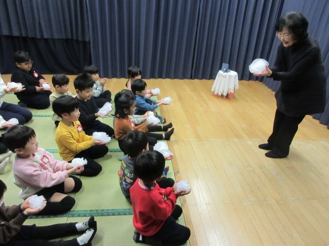 布遊び『雪こんこ』ではわらべ歌に合わせて白いフワフワの布を手で丸めて、フワッと出すことをみんなでやってみました。