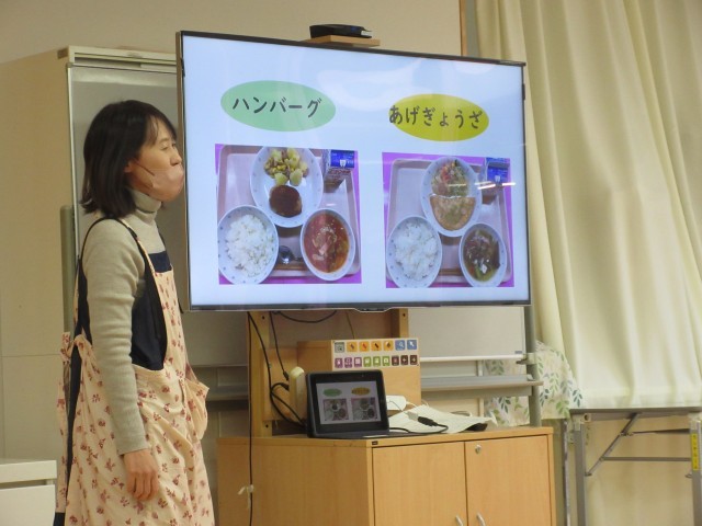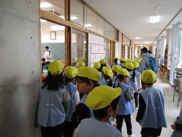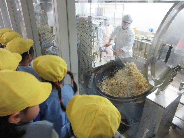 その後は学校内の見学。給食室では大きなお鍋でチャーハンを作っているところを見せてもらい、みんな「おいしそう!」と見ていました。