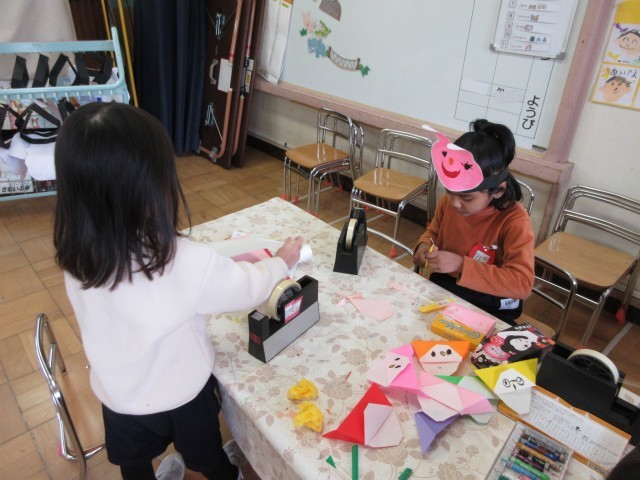絵の具で動物のお面を作ったばら組。できあがったお面がとても気に入ったようで、遊んでいるときもつけていました。