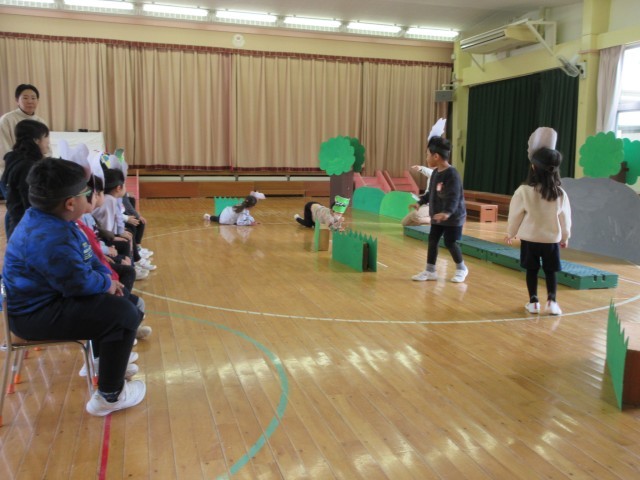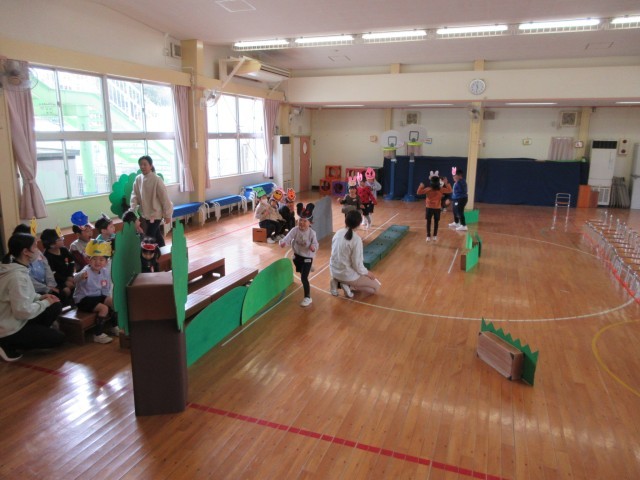今日はホールで自分たちで色を塗った木や草を置いて、劇遊びをしました。好きな動物になりきって動くことを楽しんでいます。