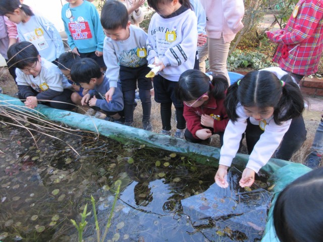 とても寒かった今朝。幼稚園の池に氷が張りました。星の組の子どもたちは氷を見つけて大喜び。
