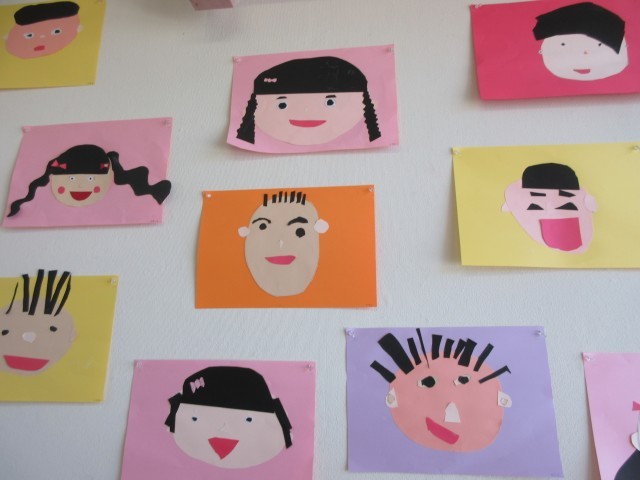 星の組は画用紙を切って自分の顔の貼り絵を作っています。「髪の毛はどんな形に切って貼る?」「目はどうしようかな」など自分たちで工夫して、考えて作っています。時間をかけてできあがった顔は、みんなすてきです!