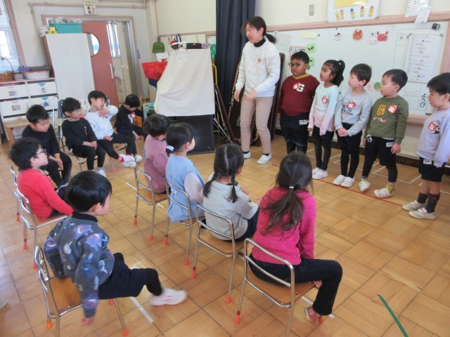 ばら組生活発表会、星の組音楽会の練習をしています。ばら組はホールで台の上に立って合奏や保育室で劇の言葉の練習をしました。