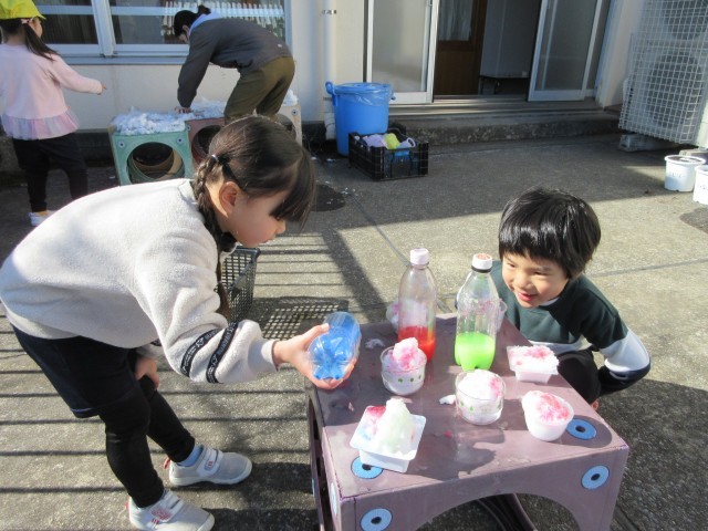 星の組は2階の屋上でカップにいれた雪に、絵の具のシロップをかけて『かき氷』を作っていました。