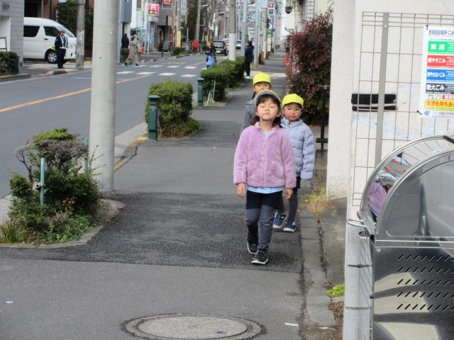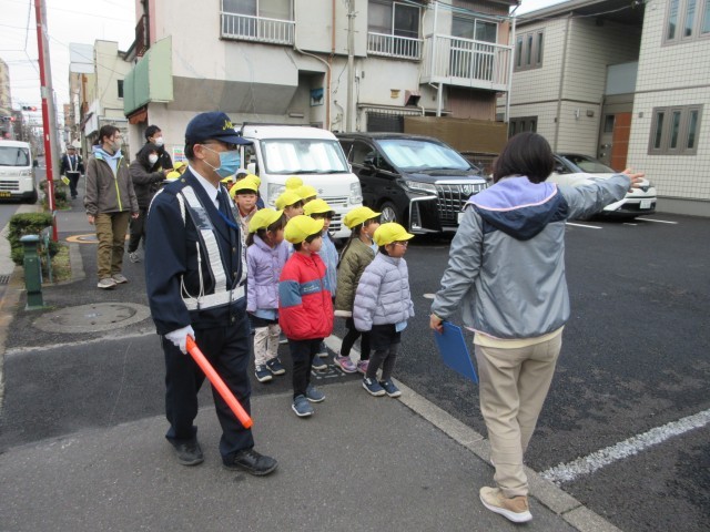 星の組は葛西警察署交通総務課の方と一緒に、路上指導を行いました。道路は端を歩くこと、信号をよく見て渡ること、信号のない道路は車や自転車が来ないか確認して渡ることなど、ご指導いただいた後、一人で道路を歩きました。一人で歩くことは初めての子どもたち。みんな落ち着いて歩くことができました。