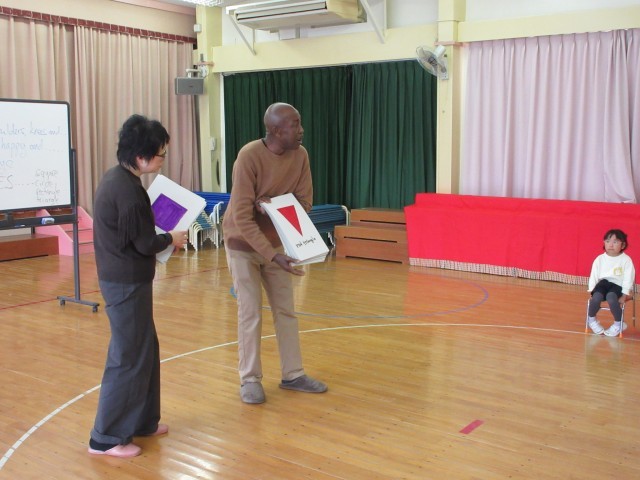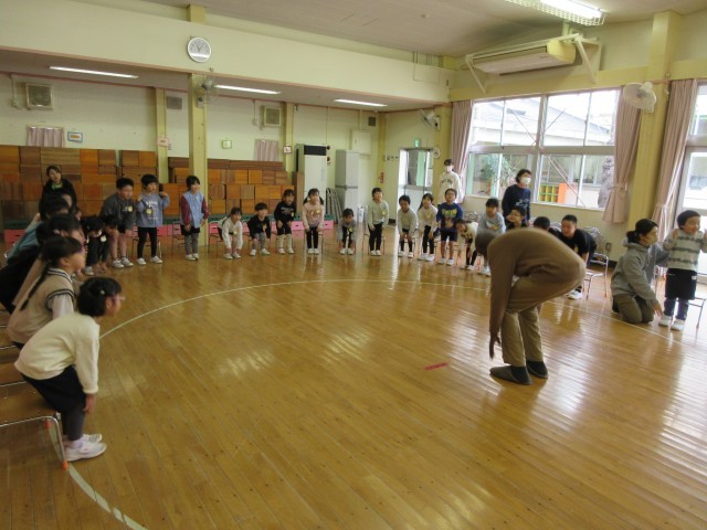星の組はホールでオウス先生と英語で遊ぼうをしました。