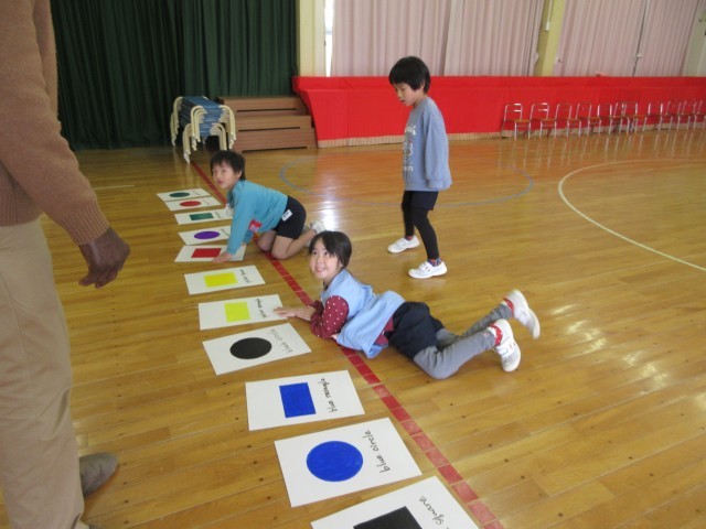 カードには色のついた○や△などが描いてあり、オウス先生の英語を聞いて同じカードをとるゲームです。