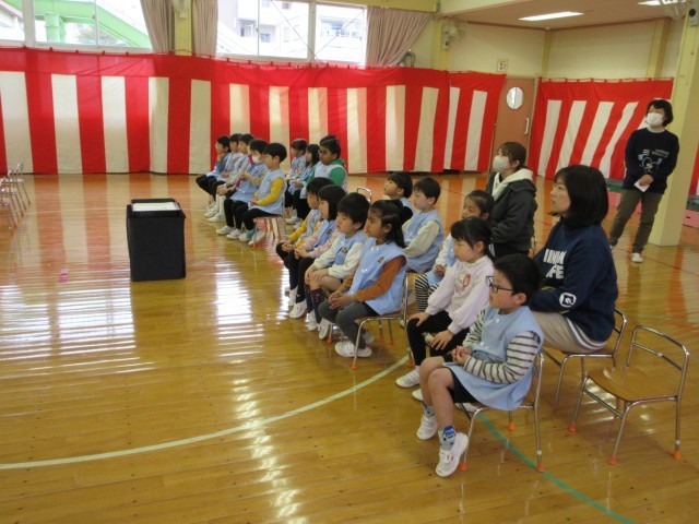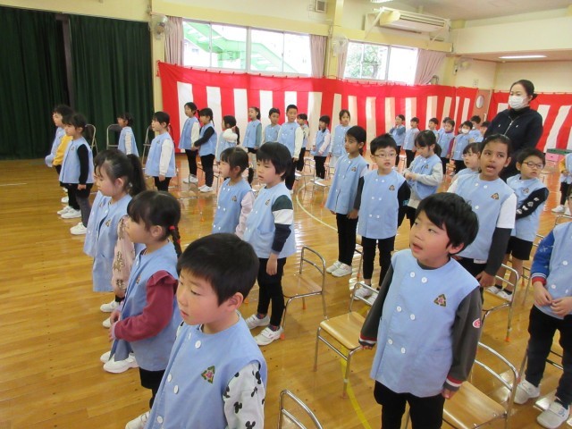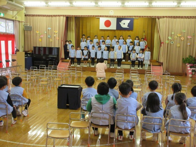 星の組はホールで終了式の練習をしました。今日はばら組が参観しました。
