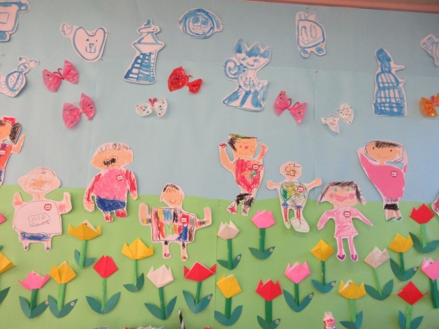 折り紙でチューリップを折ったり、絵の具で雲を描いたりして最後の壁面製作を作りました。