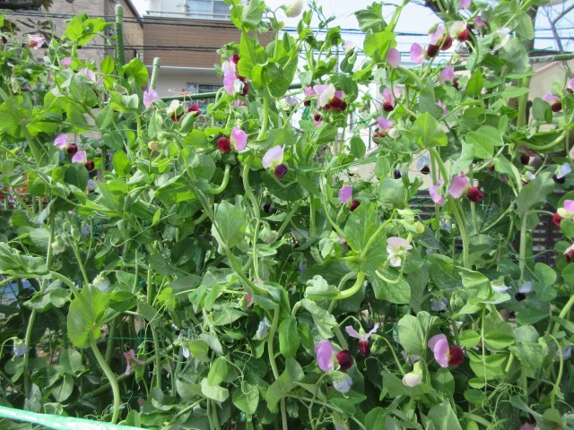 サクラは咲いていますが、満開までにはあと少し・・・。ただ、ばら組が育てているキヌサヤとソラマメの花がとてもきれいに咲いています。