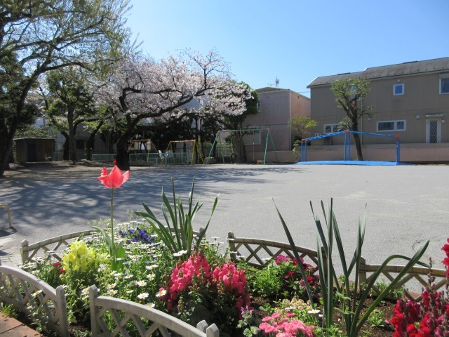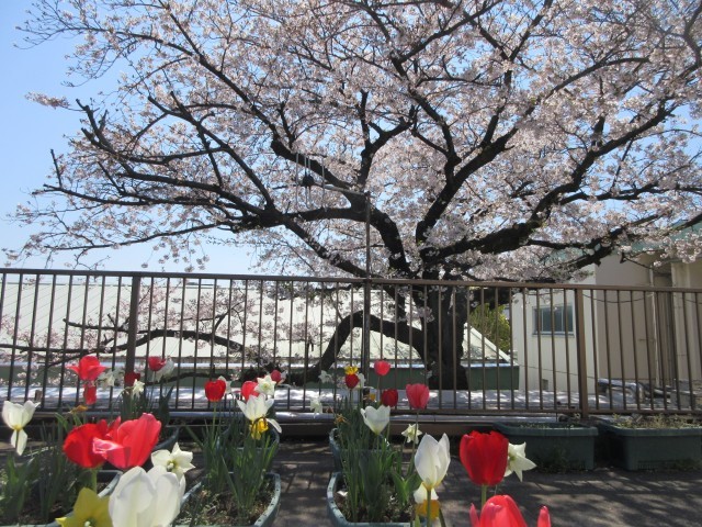 チューリップとのコラボレーションが最高です。園庭から見える新川のサクラもとてもきれいです。