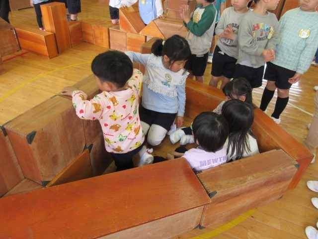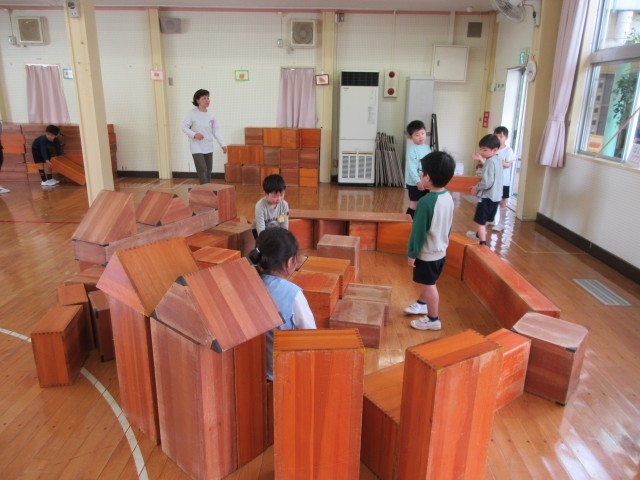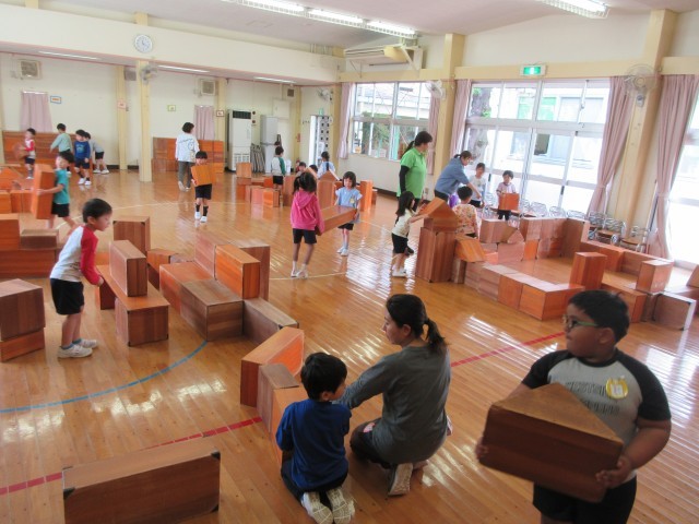 星の組はホールの大型積み木で遊びました。大きい積み木は一人でしっかり持つことや友達と力を合わせて運ぶことが大事。
