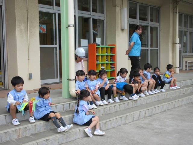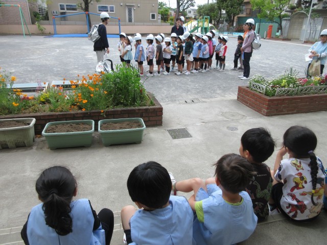 星の組は2階から降りて園庭に避難しました。ばら組は園庭から星の組の避難の様子を見ていました。