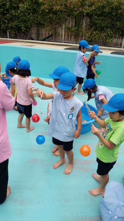 生憎の天気が続きプール掃除もできずにいました。今日も涼しい気候でしたが、プール開きはやっておきましょう!年長組はプールを雑巾掛けして綺麗にしてから水ヨーヨー釣りをしました。2階のプールでも年少組がヨーヨー釣りを楽しんでいました。本格的な水遊びが楽しめるにはもう少しかかりそうです。