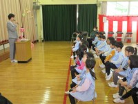 年長組はオウスさんの「英語で遊ぼう」を学級ごとに体験しました。最初は緊張していましたが「ハローソング」や「ヘッド・ショルダー・ニー&トウ」を歌ったり動いたりするうちに楽しくなってきました。「ブラック」「グリーン」など色を英語で当てるゲームもしてあっと言う間の30分でした。