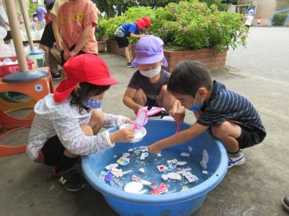 星の組のお祭りごっこ。年少組がお客さんになって金魚すくいやかき氷を楽しんでいました。魚釣りやおうちごっこ、たたかいごっこ、乗り物ごっこ…色々なごっこで楽しんでいます。