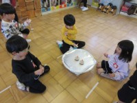 幼稚園公開初日の今日、年少組はハダシになって砂場で楽しく遊んでいました。